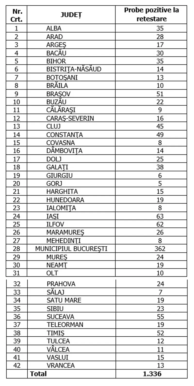 Distinct de cazurile nou confirmate, în urma retestării pacienților care erau deja pozitivi, 1.336 de persoane au fost reconfirmate pozitiv. Distribuția pe județe a acestor cazuri o regăsiți în tabelul de mai jos: