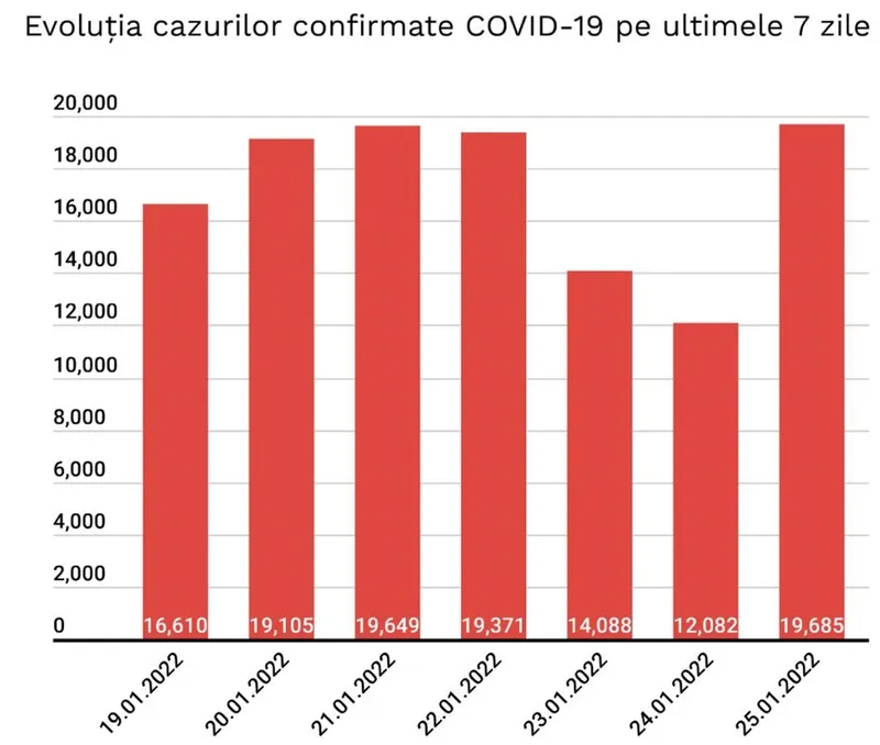 În ultimele 24 de ore au fost înregistrate 19.685 de cazuri noi de persoane infectate cu SARS – CoV – 2 (COVID – 19), cu 7.603 mai mult decât în ziua anterioară. 1.740 dintre cazurile noi din 24 de ore sunt ale unor pacienți reinfectați, testați pozitiv la o perioadă mai mare de 180 de zile după prima infectare.