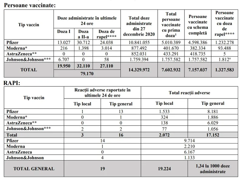 Din cele 79.170 de doze de vaccin administrate în ultimele 24 de ore, cele mai multe au fost de rapel (peste 32.000), iar cele mai puține cu prima doză - 19.950. Doza a treia au primit-o 27.110 persoane.