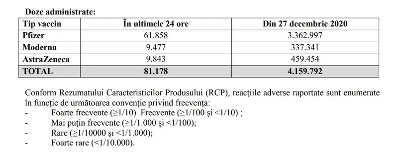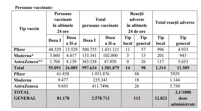 Vaccinarea cu Pfizer a început în România în 27 decembrie, cu Moderna în 4 februarie, iar AstraZeneca din 15 februarie.