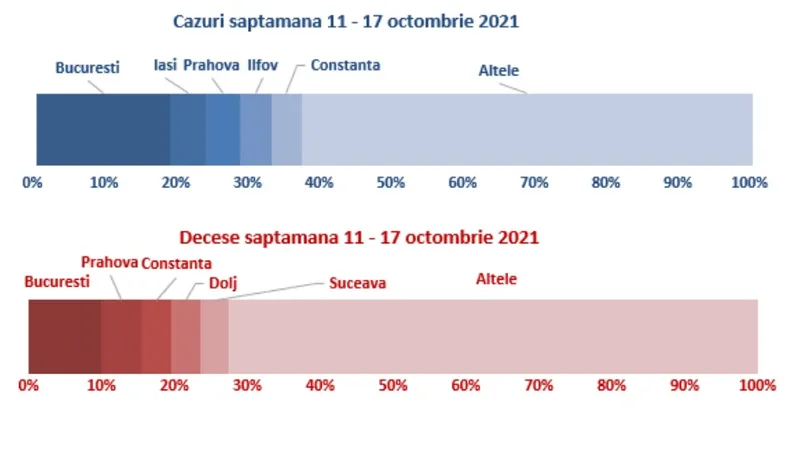 În săptămâna 11 - 17 octombrie 2021, 37,1% din totalul cazurilor s-au înregistrat in București, Iași, Prahova, Ilfov si Constanta, arată raportul INSP.