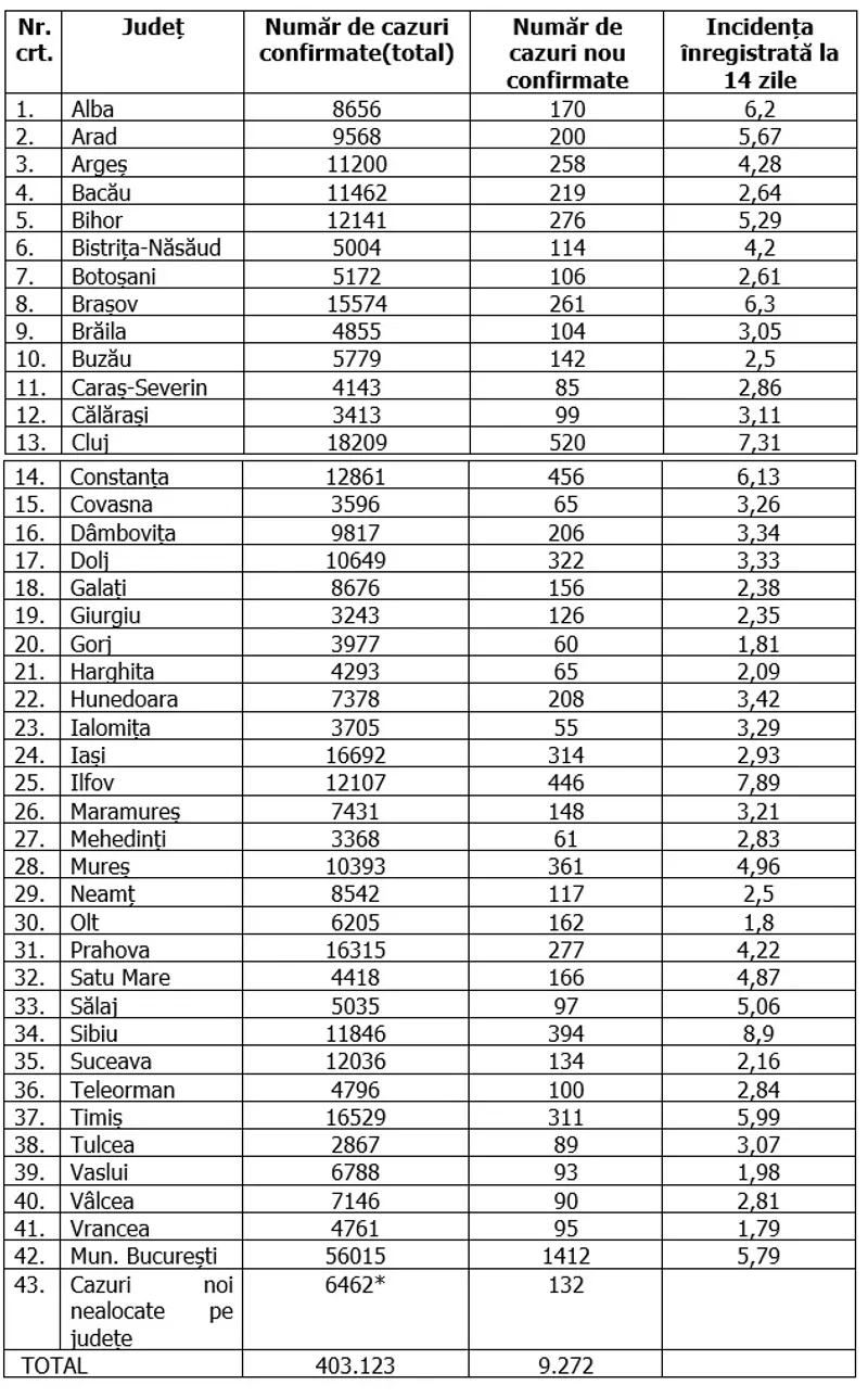 În urma testelor efectuate la nivel național, față de ultima raportare, au fost înregistrate 9.272 cazuri noi de persoane infectate cu coronavirus, acestea fiind cazuri care nu au mai avut anterior un test pozitiv.