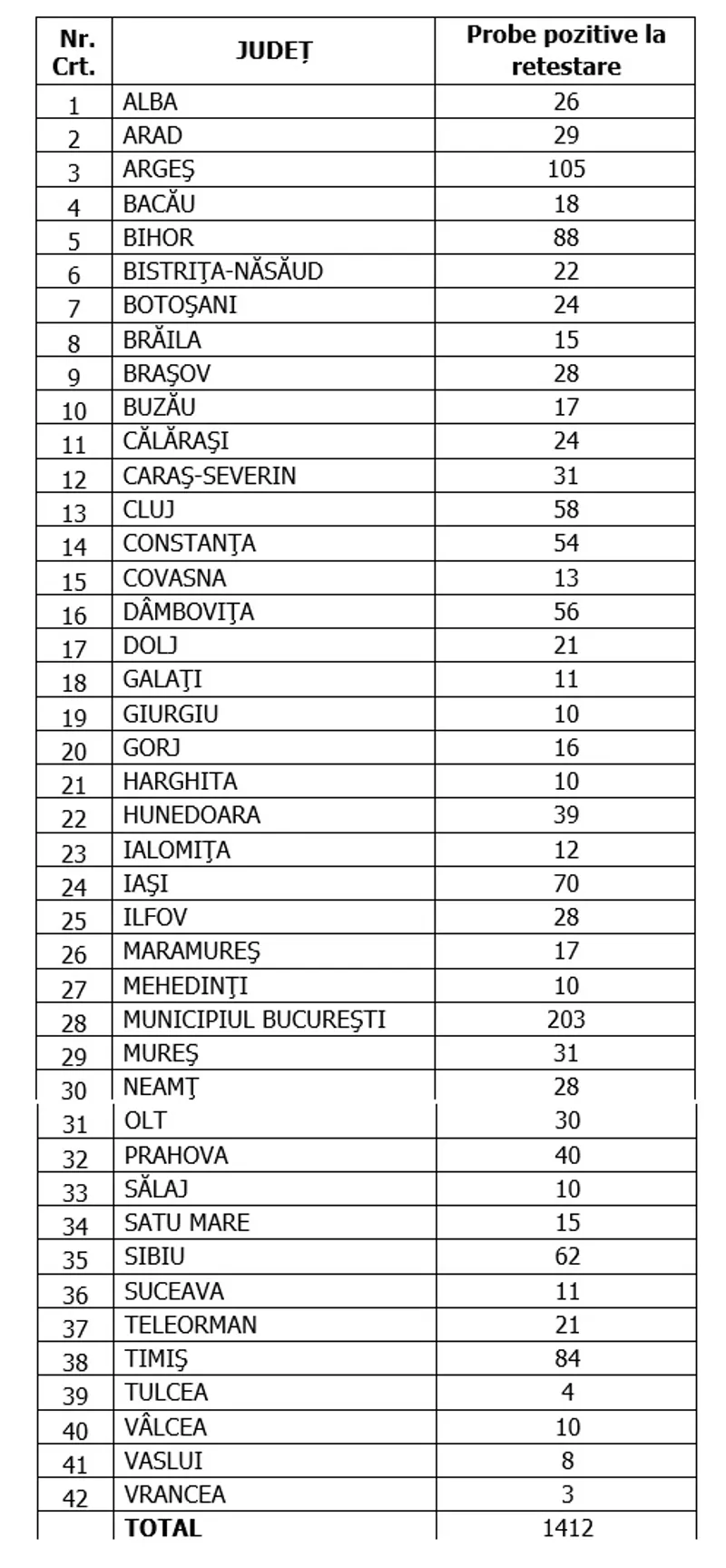 Distinct de cazurile nou confirmate, în urma retestării pacienților care erau deja pozitivi, 1.412 persoane au fost reconfirmate pozitiv.