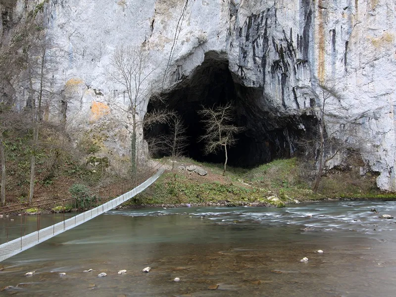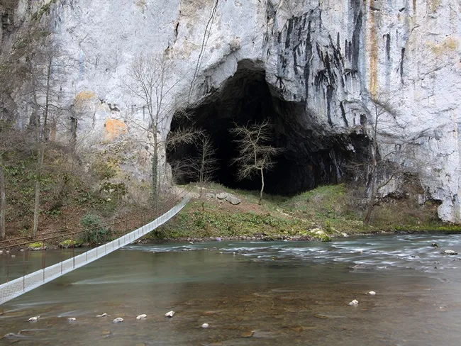 Peștera din România unde curge un pârâu alb „ca laptele”. Aici au trăit oameni în Epoca Bronzului. Intrarea în peșteră se face printr-un adevărat portal.