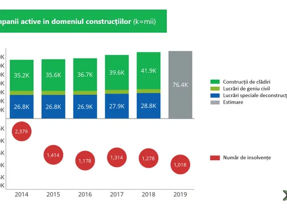 Aproximativ 75 mii de companii (10% din total) care și-au raportat rezultatele pentru 2018 au avut ca principal domeniu de activitate unul dintre codurile CAEN aferente sectorului de construcții, în creștere cu 4,3% față de 2017 și cu 12,7% față de 2014.
