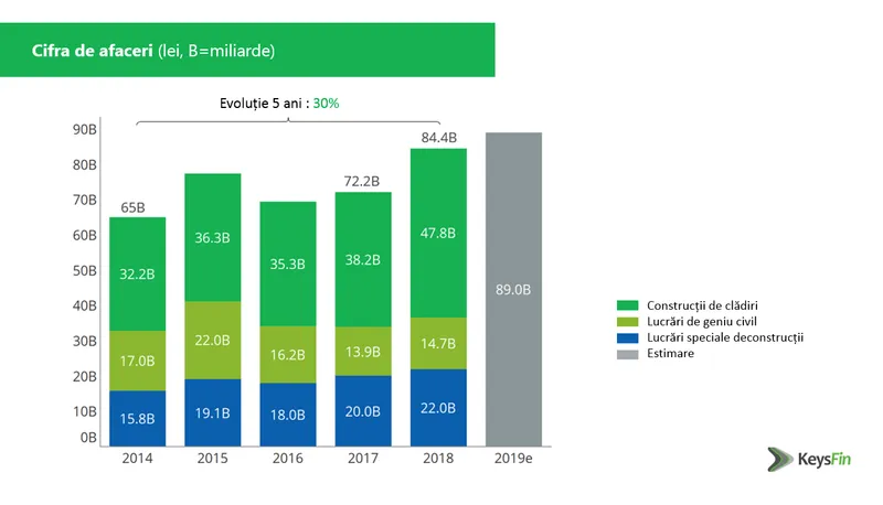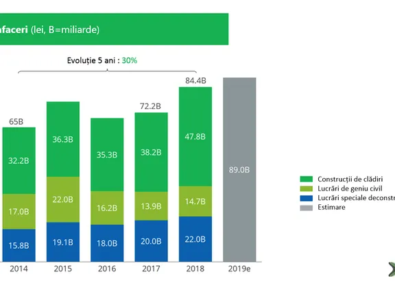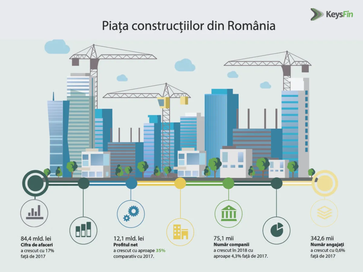 Conform unei analize realizate de KeysFin, cifra de afaceri a pieței locale de construcții a crescut cu 17% față de 2017 și a depășit cu aproape 30% nivelul din 2014, ajungând la peste 84,4 miliarde de lei în 2018.