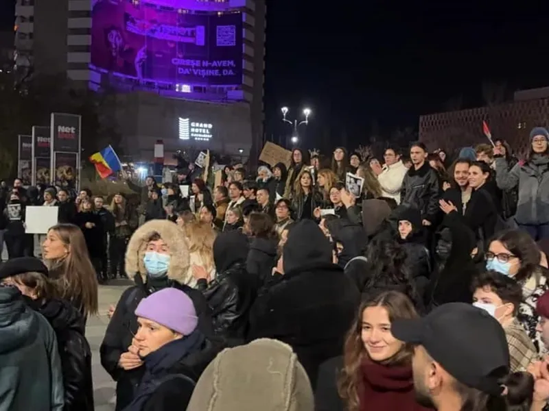 Piața Universității, protest spontan: sute de tineri împotriva pericolului dictaturii sub Georgescu. Aproximativ 400 de persoane s-au strâns în fața Teatrului Național București, afișând pancarte cu mesaje precum „RIP dreptului la avort” și „Jos C.G.”.
