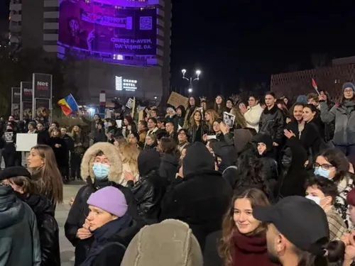 Aproximativ 400 de persoane s-au strâns în fața Teatrului Național București, afișând pancarte cu mesaje precum „RIP dreptului la avort” și „Jos C.G.”.