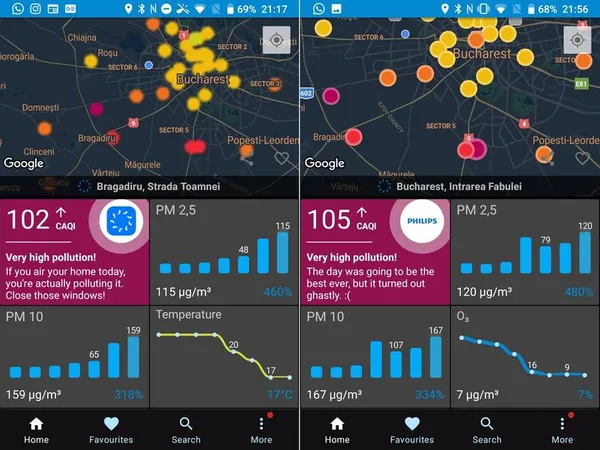 Aproape toți senzorii erau colorați în roșu, galben sau portocaliu, ceea ce indică depășiri pentru cei doi poluanți, dincolo de limita maxim admisă și sigură pentru populație. Asta deși era noapte și weekend, iar traficul, considerat unul dintre principalii poluatori, era aproape inexistent la acea oră. Și rețeaua Ministerului Mediului a înregistrat depășiri, însă noaptea trecută în București doar o singură stație din cele 8 a înregistrat poluarea pentru PM 2,5 și 3 pentru PM 10. Duminică dimineață lucrurile au revenit la normal, potrivit Hotnews.
