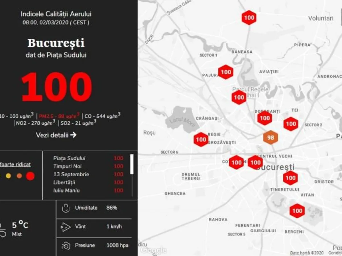 Platformele de măsurare a calității aerului airly.eu și aerliver.ro au raportat duminică seara până luni dimineața niveluri record ale indicilor de poluare din București.