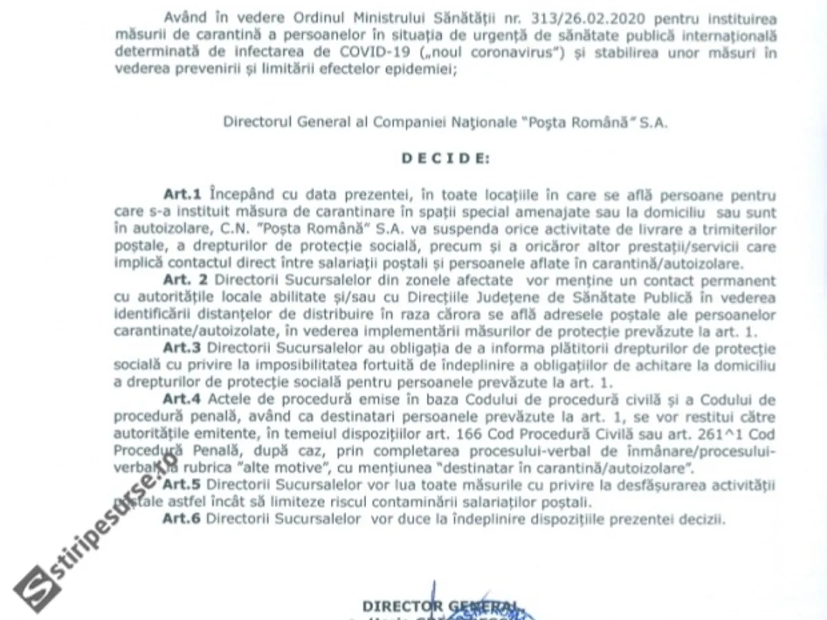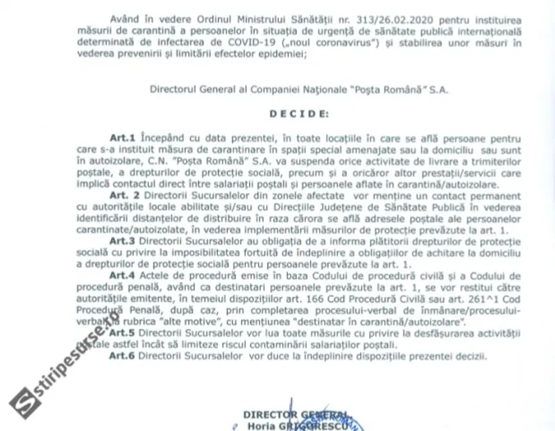Directorul General al Poștei Române, Horia Grigorescu, a trimis o circulară către oficiile poștale prin care le solicită poștașilor să nu mai livreze pensiile și alocațiile către cetățenii aflați în carantină din cauza coronavirusului, conform stiripesurse.ro .