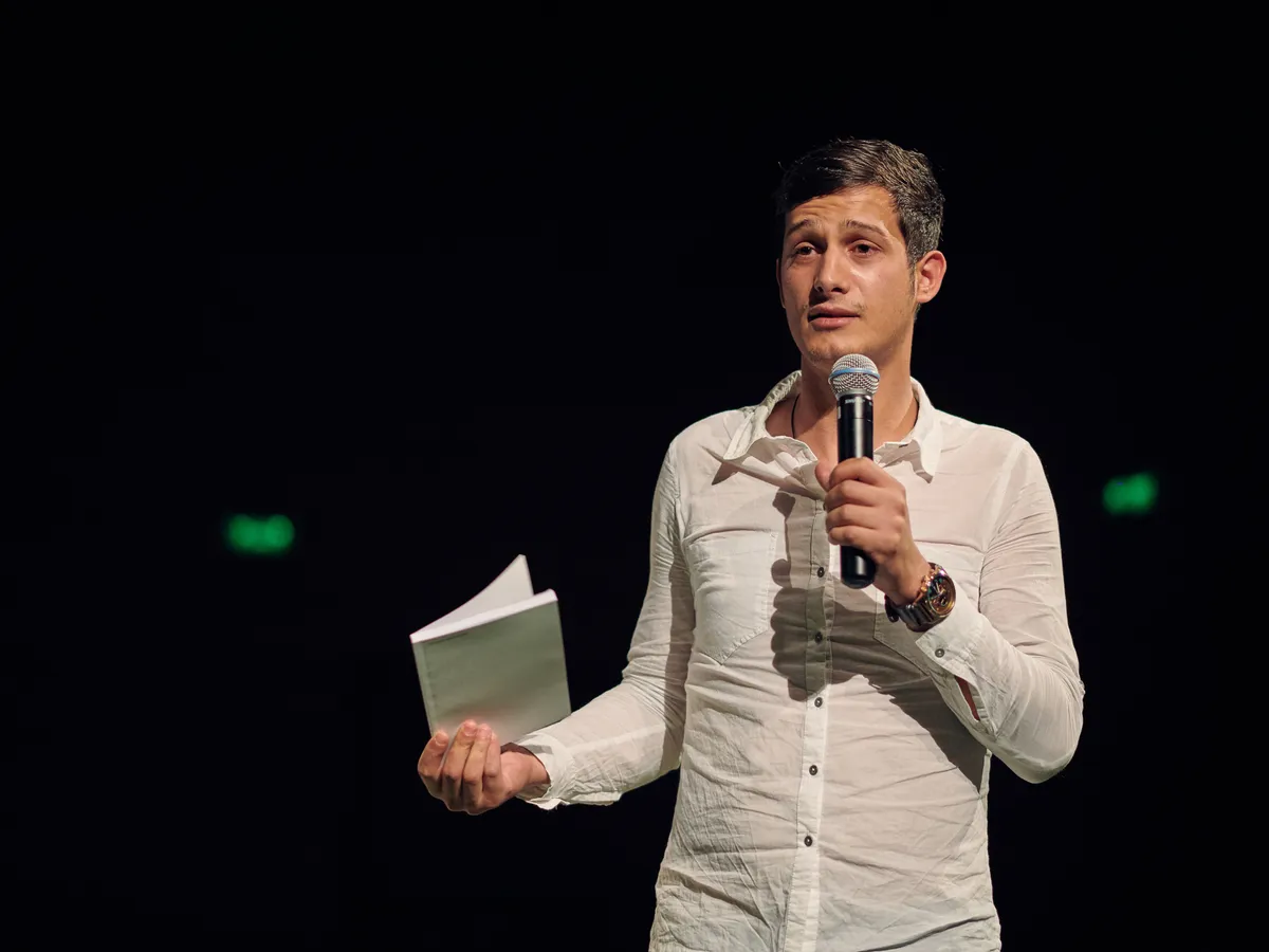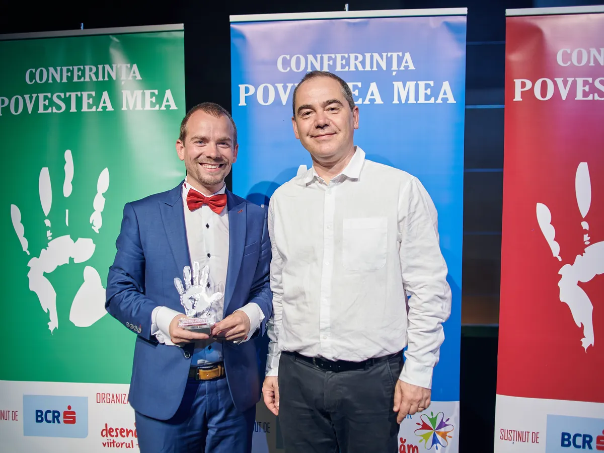 Cosmin ține în mână cartea ”Împreună”, unde apare și povestea vieții lui, în cadrul conferinței organizate de asociația ”Vocea Copiilor Abandonați”.