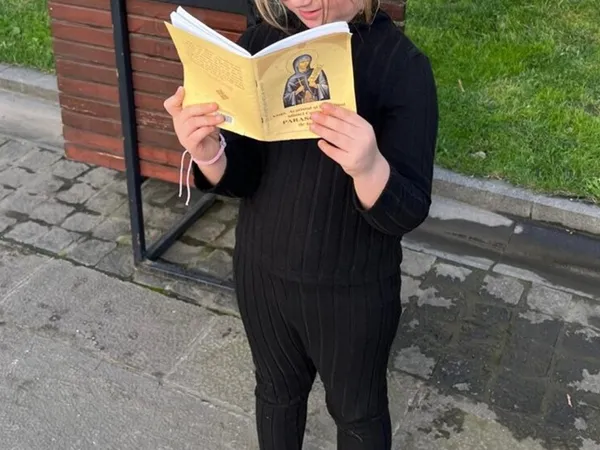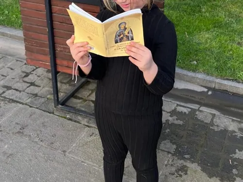O altă fetiță blondă, de 4 ani și 8 luni, răsfoia Acatistul Cuvioasei, de parcă voia să-l învețe dintr-o suflare.