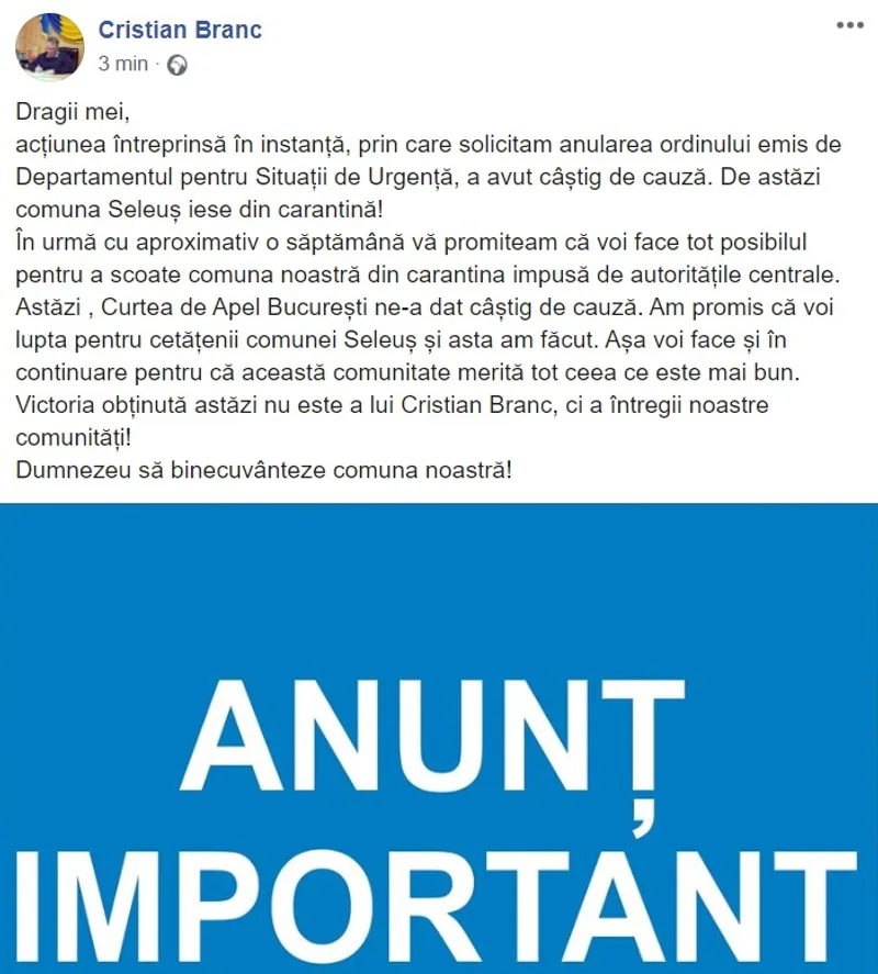 „Iniţial am susţinut ideea carantinei, pentru că am avut 55 de cazuri, dar apoi am avut doar câteva cazuri noi şi nu se mai justifică o astfel de măsură. Am luat decizia să apelez la instanţă şi pentru că locuitorii comunei mi-au cerut o reacţie, fiind foarte nemulţumiţi. Noi suntem recunoscuţi pentru cultivarea legumelor, iar localnicii îşi vând produsele în toată ţara, mai ales în Ardeal. De când s-a auzit că suntem în carantină, producătorii din Seleuş au mari dificultăţi în a-şi vinde mărfurile, clienţii se feresc de ei când află de unde provin”, spunea, la acel moment, primarul Cristian Branc (PNL), din Seleuș, pentru Agerpres. La acel moment, comuna avea 60 de cazuri active, iar primarul și viceprimarul fuseseră, la rândul lor, confirmați cu coronavirus.
