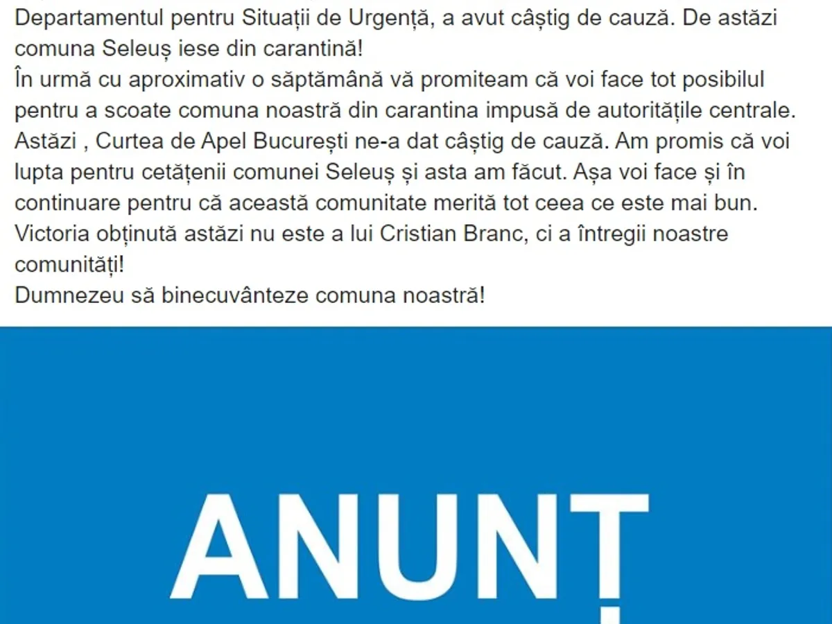 PRECEDENT Seleuș câștigă în instanță ridicarea carantinei. Edilul: Dumnezeu să binecuvânteze comuna