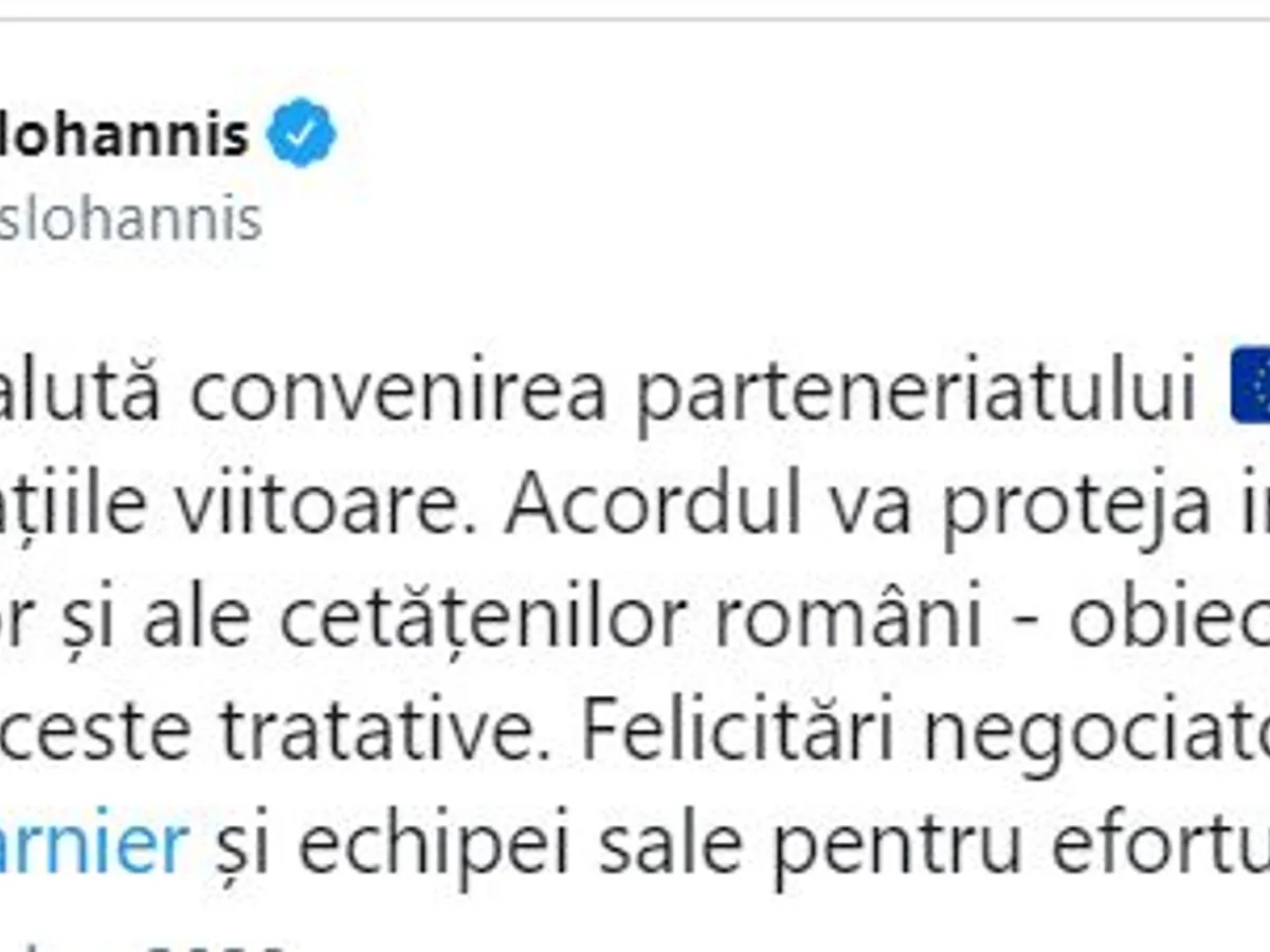 „România salută convenirea parteneriatului dintre Uniunea Europeană și Regatului Unit privind relațiile viitoare. Acordul va proteja interesele companiilor și ale cetățenilor români - obiective-cheie ale României în aceste tratative. Felicitări negociatorului-șef @MichelBarnier și echipei sale pentru efortul susținut!”, este mesajul președintelui Klaus Iohannis, după ce Londra și Bruxelles-ul au reușit să ajungă la un acord comercial post-Brexit.