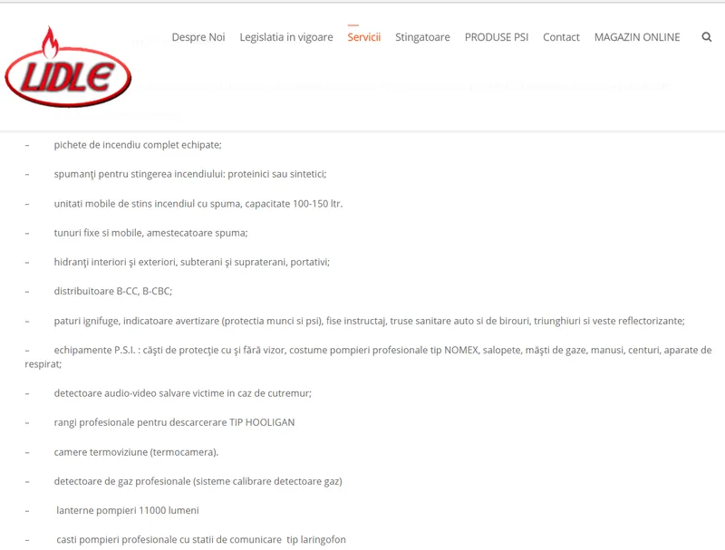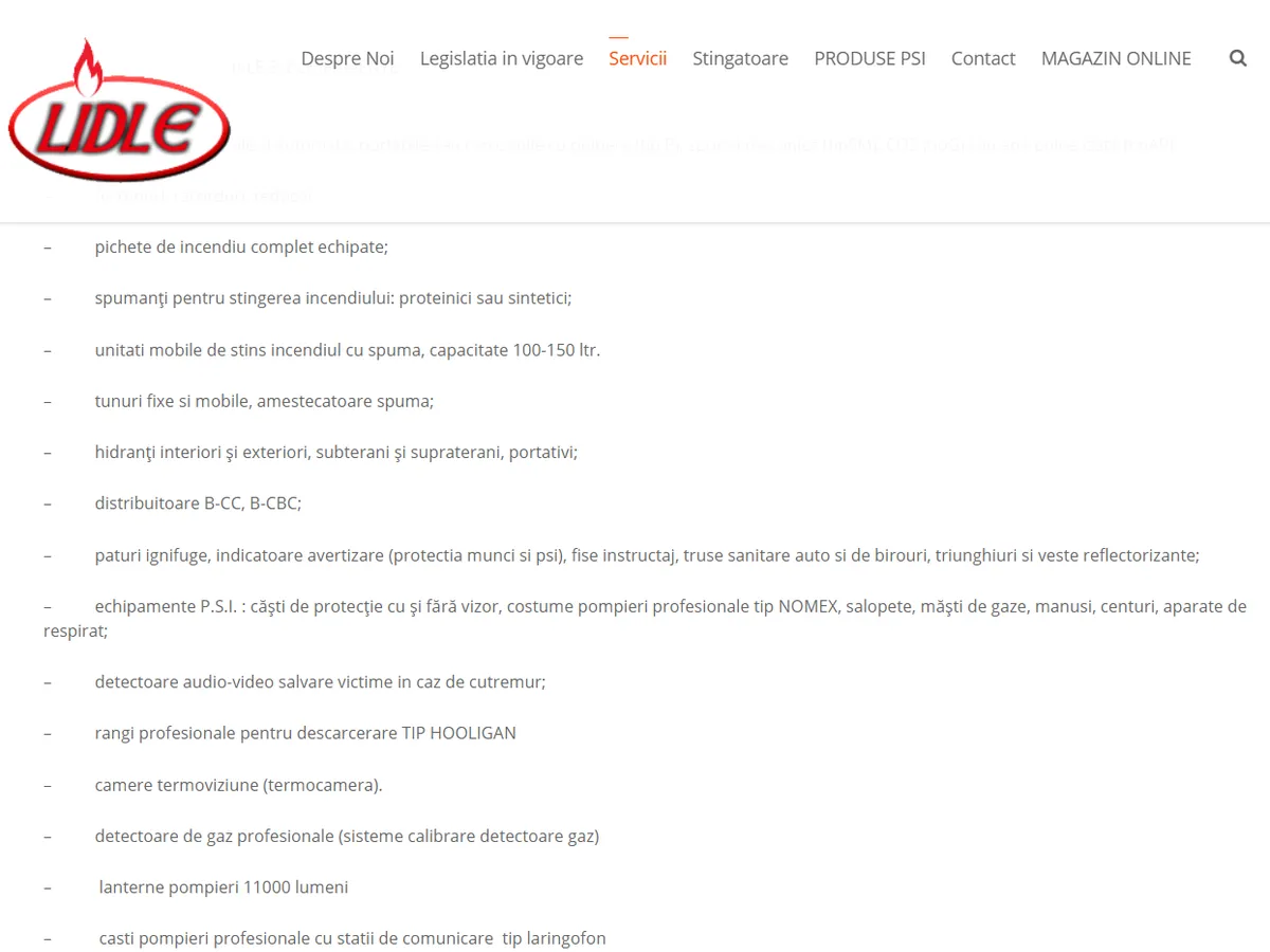 Lidle Com SRL este o companie care furnizează echipamente și accesorii destinate stingerii incendiilor (stingatoare, furtunuri, spumanți, echipamente și accesorii PSI), precum și pentru executarea operaţiunilor de verificare, intreţinere si reparaţii la sisteme instalaţii, aparate si dispozitive de stins incendii (hidranti interiori-exteriori, hidranti subterani-supraterani).