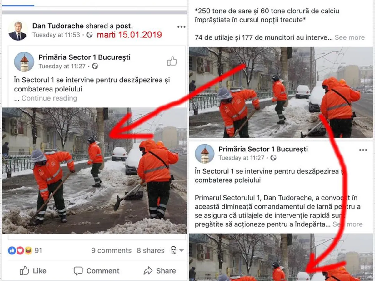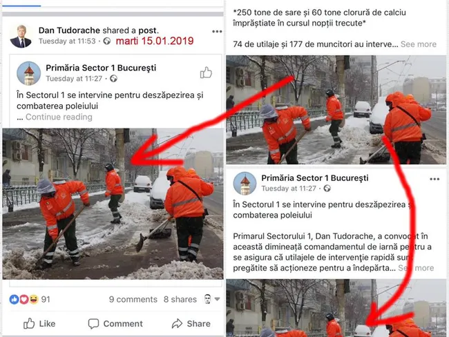 „#1yearchallenge cu Tudorache de la Primăria Sectorului 1. Fakenews „pe față” la nivel de comunicare oficială. Tudorache minte cum dă zăpada, punând fotografii cu angajați care dădeau zapada acum un an! Descriere: Lucrătorii de la deszăpezire au înghețat în aceeași poziție: martie 2018 - ianuarie 2019” este descrierea postării de pe Facebook a liberalei Violeta Alexandru, prin care aceasta atrage atenția asupra acțiunii primăriei.