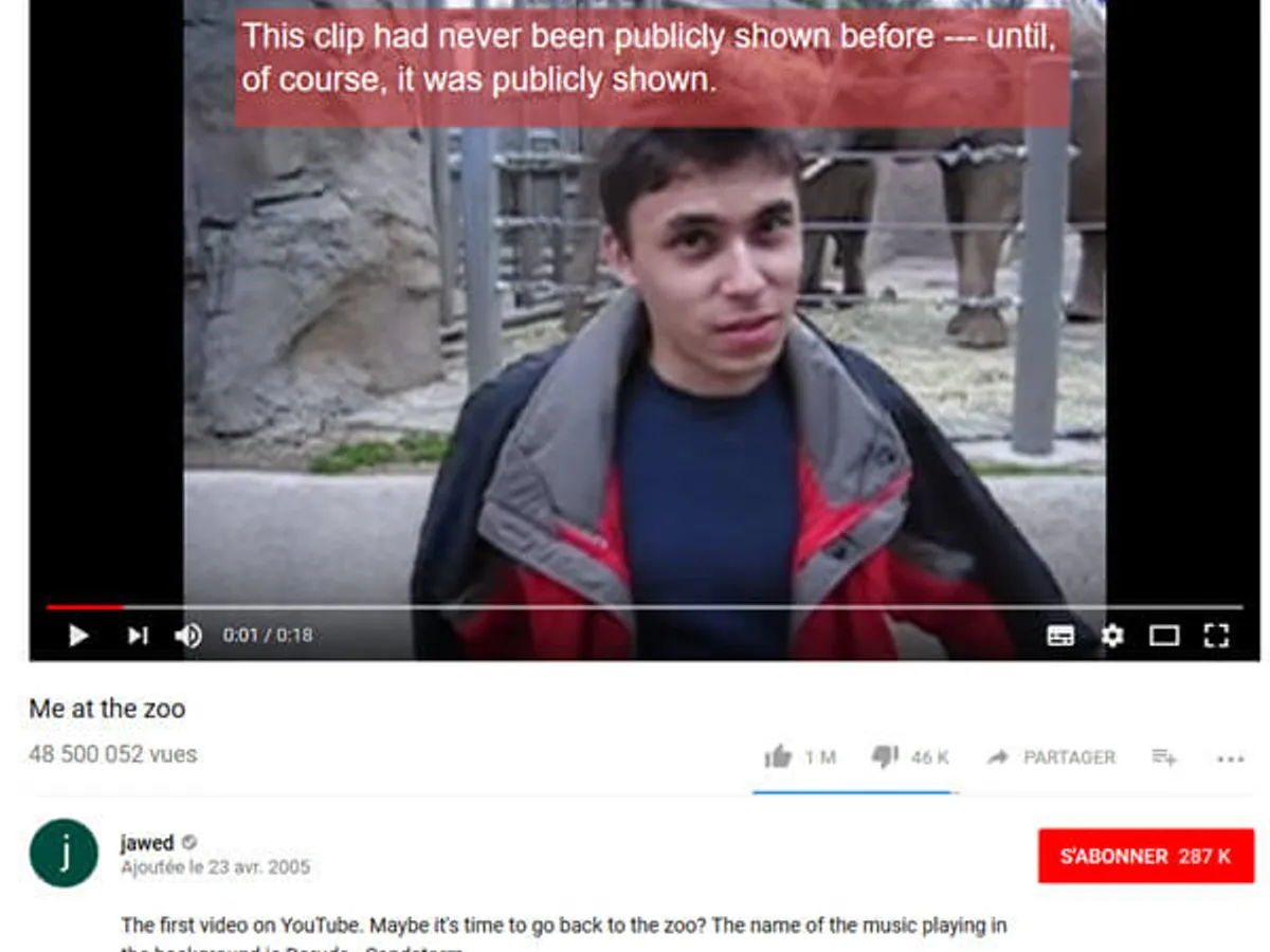 Intitulat „Me at the Zoo” (n.red. Eu la grădina zoologică), în clip apărea un puşti care vorbea despre lungimea trompei elefanţilor din spatele său. Clipul a fost filmat în San Diego, a avut 18 secunde, iar în cei 15 ani a strâns peste 90 de milioane de vizualizări.