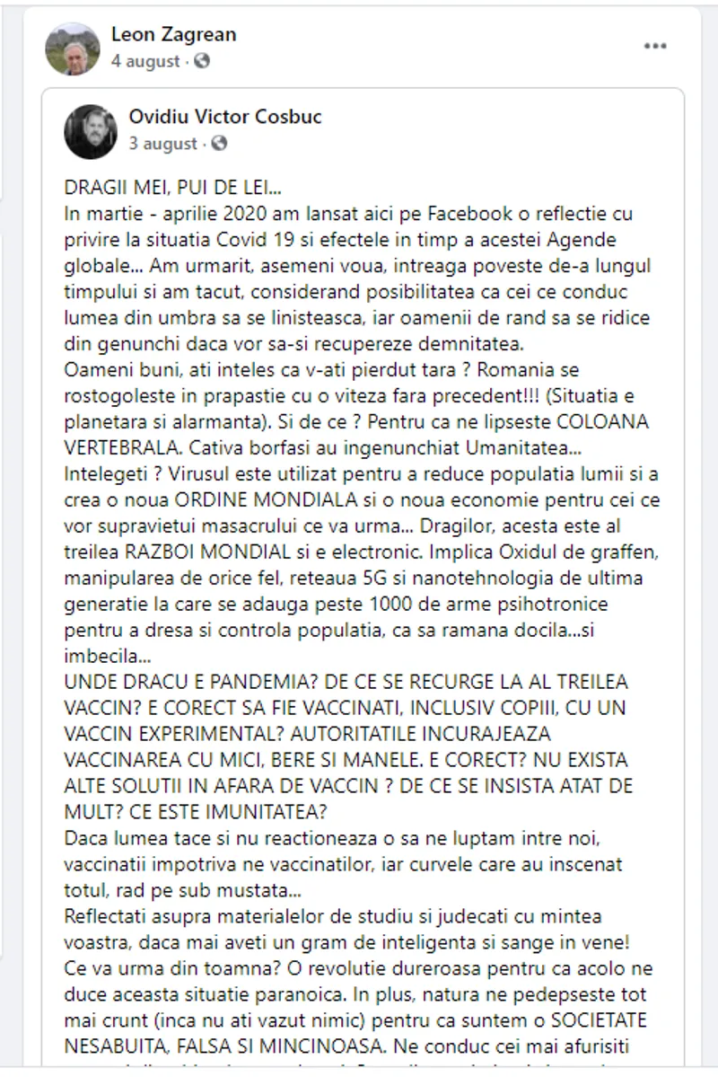 Oameni buni, aţi înţeles că v-aţi pierdut ţară ? România se rostogoleşte în prăpastie cu o viteză fără precedent!!! (Situaţia e planetară şi alarmantă). Şi de ce ? Pentru că ne lipseşte COLOANA VERTEBRALĂ. Câţiva borfaşi au îngenunchiat Umanitatea... Înţelegeţi ?”, scrie Ovidiu Coșbuc, distribuit de șeful de catedră de la UMF „Carol Davila” din București.