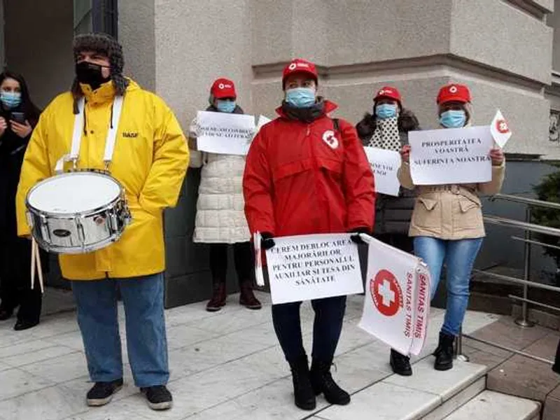 Mai mulți angajați din domeniul sănătății protestează în fața Guvernului pe fondul apariţiei OUG nr. 226/2020, care prevede îngheţarea salariilor şi pensiilor în acest an.