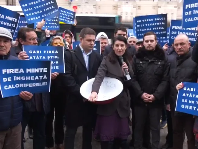 De asemenea, protestatarii poartă pancarte pe care au scris: „Gabriela Firea atâta ştie, să ne ţină-n gheţărie”, „Firea minte de îngheaţă caloriferele”, „Nu vrem bâlci, nici tevatură, doamna Firea, vreau căldură”, „Firea, mă laşi rece” sau „În democraţie nu mori de hipotermie”.
