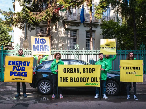 „Atacurile rusești asupra Ucrainei s-ar opri „într-o lună sau două” dacă aliații occidentali ar înceta să cumpere petrol și gaze rusești, a declarat fostul consilier economic șef al lui Putin, dr. Andrei Illarionov. Ungaria este una dintre ţările care se opun unui veto pentru achiziţia de petrol rusesc, în cadrul celui de-al şaselea pachet de sancţiuni pe care îl pregăteşte Comisia Europeană pentru Rusia. Greenpeace a transmis așadar un mesaj șefului guvernului de la Budapesta, Viktor Orbán, direct în fața Ambasadei din București, prin mesajele de pe pancarte: Elég a véres olajból!, Orbán, stop the bloody oil (Ajunge cu petrolul sângeros!) și Orbán, STOP petrol ACUM!”, se arată într-un comunicat Greenpeace.