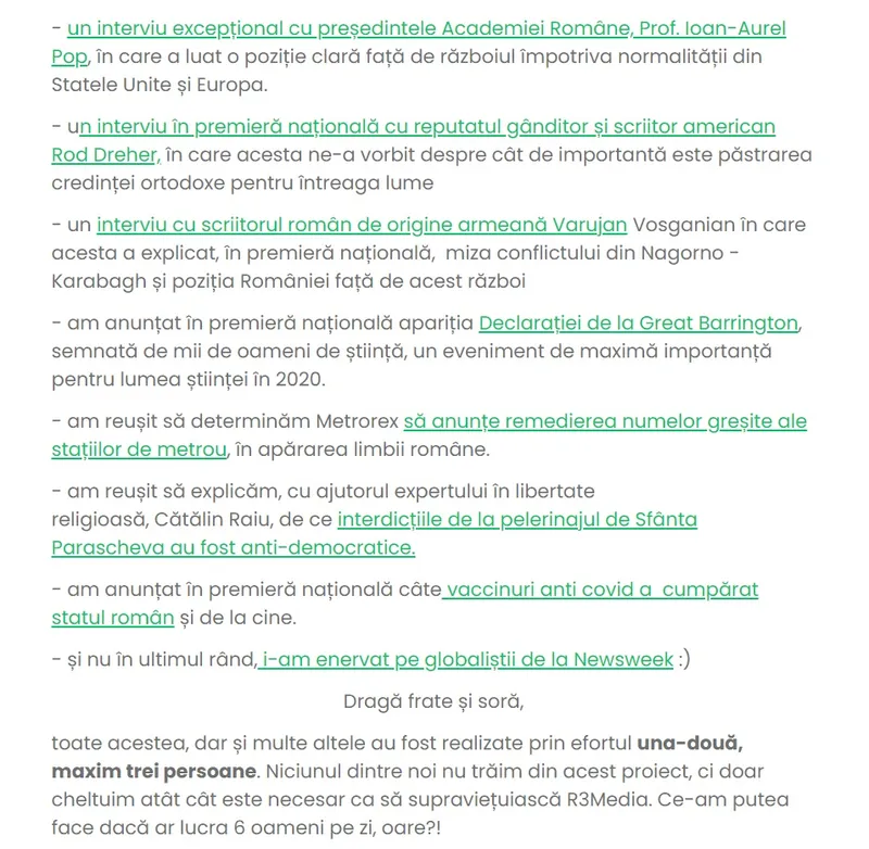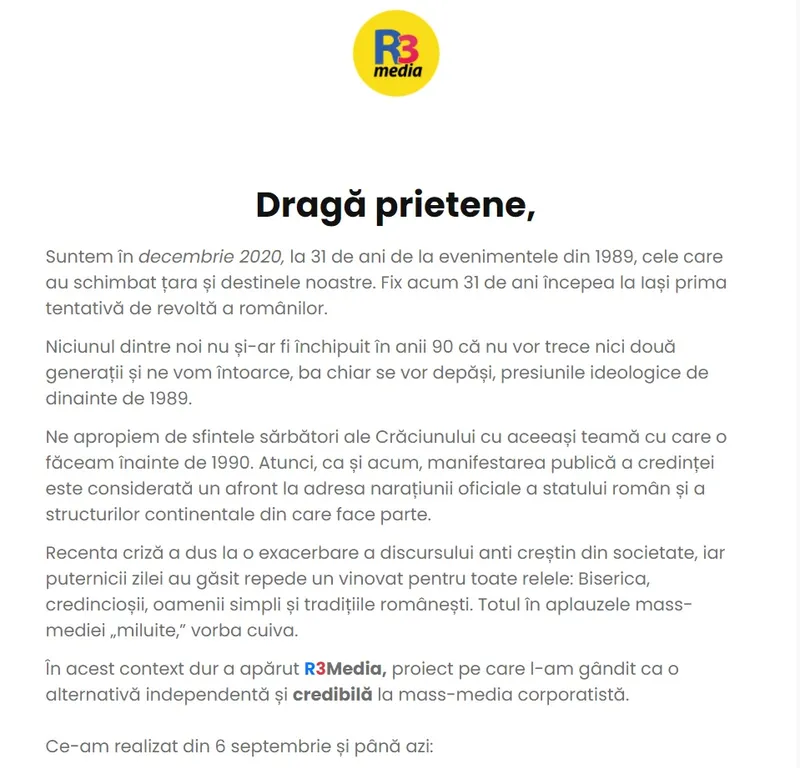 În acest newsletter trimis abonaților R3Media, publisher-ul Mihai Șomănescu își prezintă site-ul ca pe „alternativă independentă și credibilă la mass-media corporatistă”, cerându-le cititorilor să doneze pentru publicație, incluzând la motive și „i-am enervat pe globaliștii de la Newsweek :) ”.