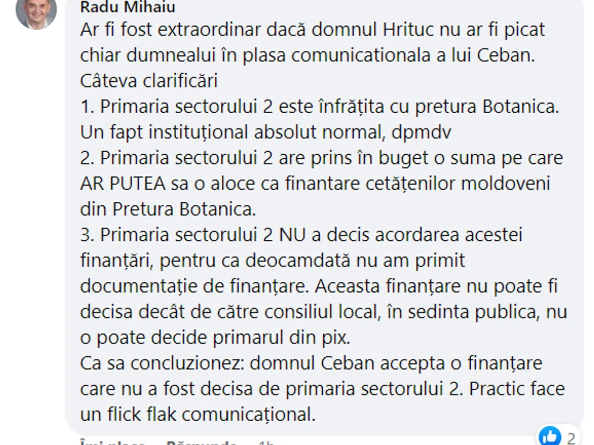 „Primarul sectorului 2, Radu Mihaiu, s-a gândit să finanțeze primăria pro-rusului Ion Ceban cu 1 milion de lei, circa 200.000 euro. Informația privind suma o am din Chișinău. În România, pe site-ul primăriei nu am găsit suma care se alocă Chișinăului.