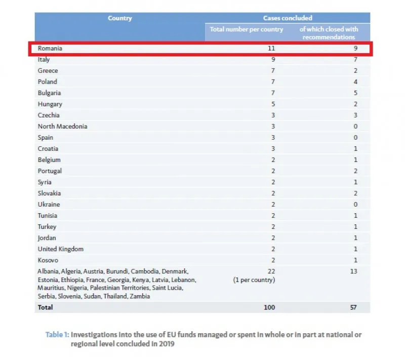 România este țara împotriva căreia Oficiul European de Luptă Antifraudă (OLAF) a soluționat în 2019 cele mai multe investigații privind managementul și cheltuirea fondurilor europene. Mai mult de o zecime din totalul de 100 de dosare se referă la fraude cu fonduri europene în țara noastră, potrivit raportului OLAF pe 2019.