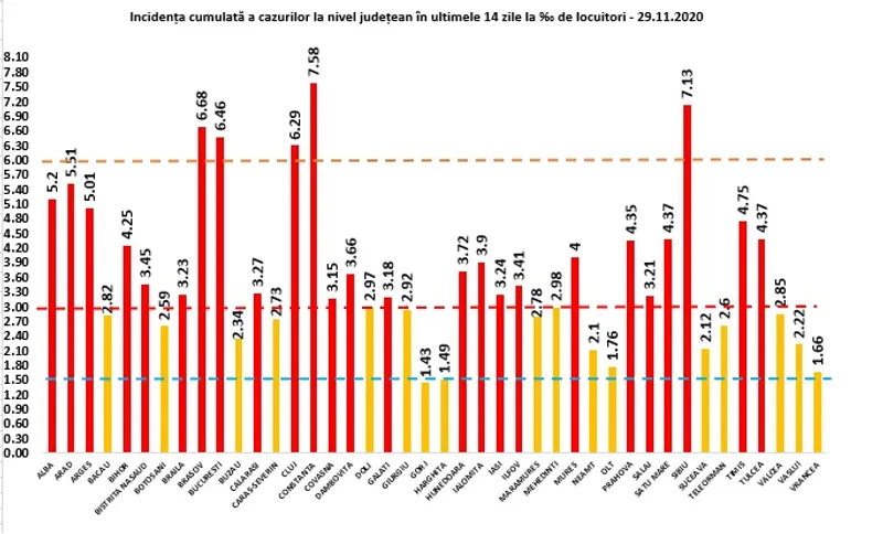 Judeţele cu incidenţă mică a cazurilor de infectare la mia de locuitori, în ultimele două săptămâni, sunt Gorj - 1,43, Harghita - 1,49 şi Vrancea - 1,66.