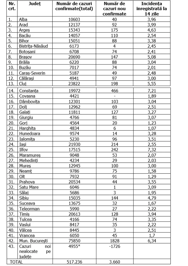 Situația cazurilor noi de infectare cu coronavirus, depistate în ultimele 24 de ore, arată astfel: