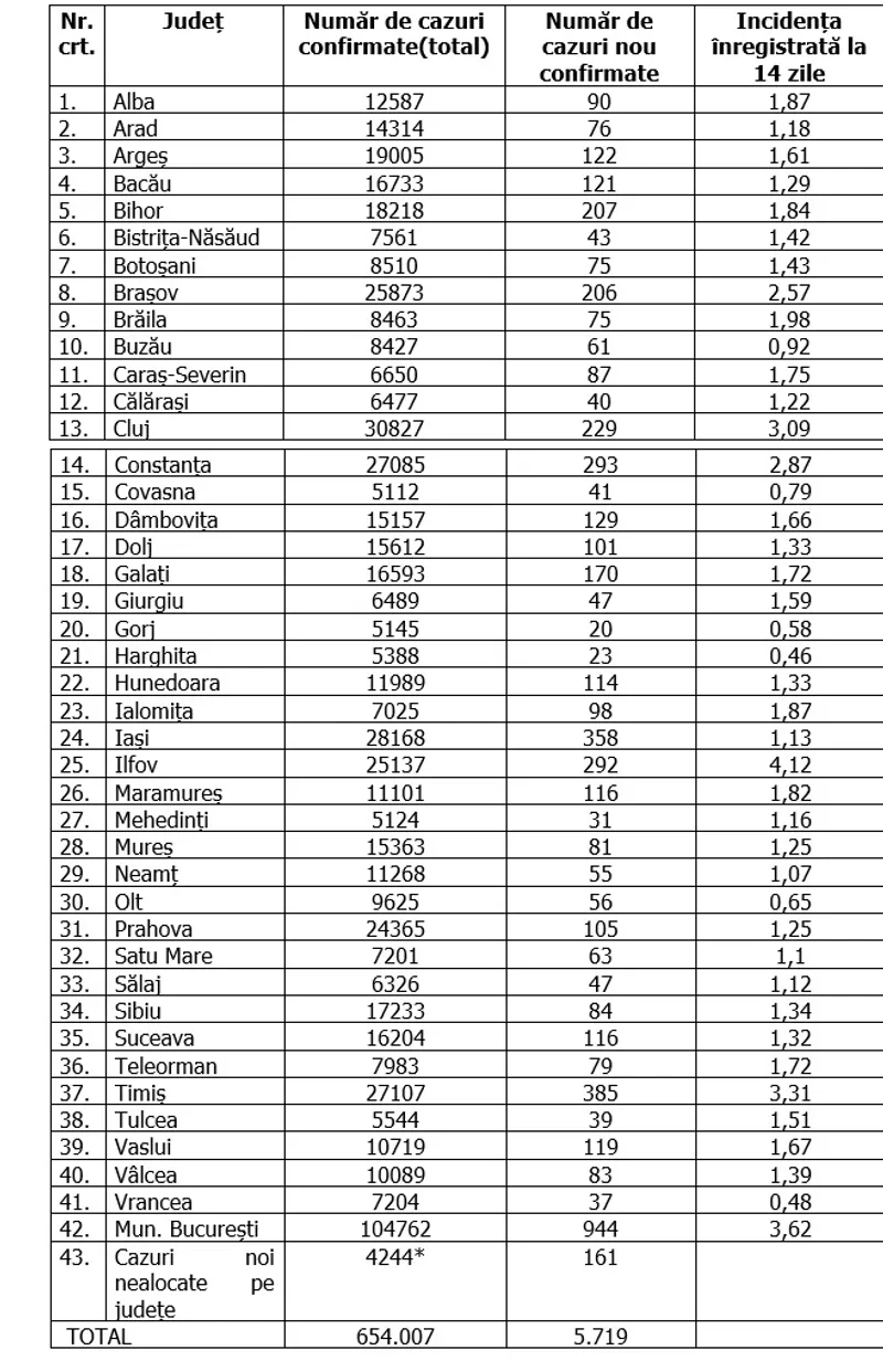În ceea ce privește cazurile noi de infectare cu coronavirus, confirmate în ultimele 24 de ore, situația arată astfel: