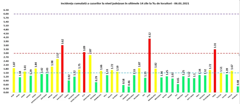 Trei județe și Capitala continuă să fie în zona roșie, raportând rate de infectare de peste 3 la mia de locuitori: Ilfov - 4,12 infectări la mie, București - 3,62 infectări la mie, Timiș - 3,31 infectări la mie și Cluj - 3,09 infectări la mie, conform datelor GCS.