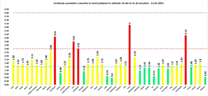 Doar 12 județe sunt în zona verde, adică raportează o incidență mai mică de 1,5 la mie. Județele cu cea mai mică rată de infectare sunt: Vrancea - 0,65 la mie, Olt - 0,71 la mie, Harghita - 0,6 la mie, Gorj - 0,74 la mie, Buzău - 0,98 la mie.
