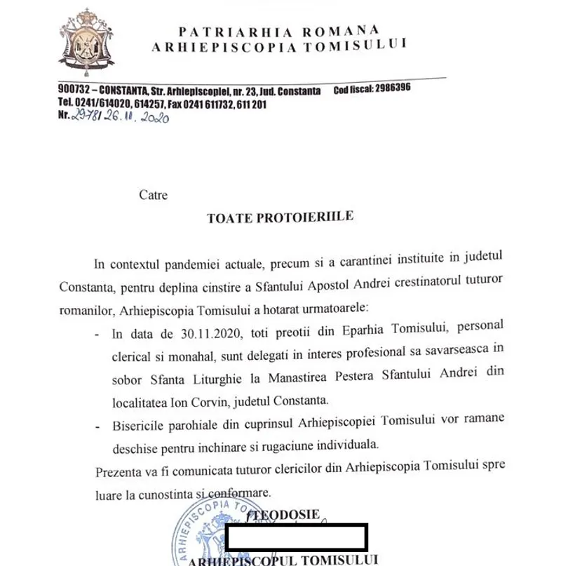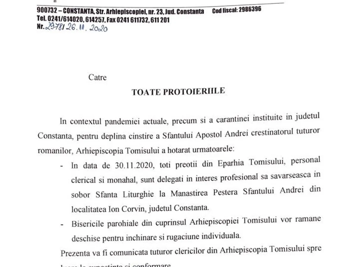 Un document intern semnat de Arhiepiscopul Teodosie al Tomisului, trimis joi protoieriilor din eparhie, le aduce la cunoștință tuturor preoților ca pe 30 noiembrie „sunt delegați în interes profesional să săvârșească în sobor Sfânta Liturghie la Mănăstirea Peștera Sf. Andrei.