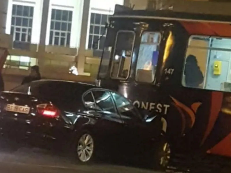 Un șofer care conducea un BMW cu numere de Botoșani a intrat perpendicular într-un tramvai care urca spre Copou, în fața Casei Studenților din Iași, arată Ziarul de Iași.