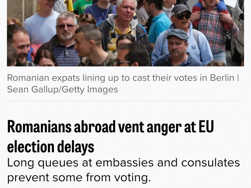 „Românii din străinătate și-au exprimat furia pentru așteptarea de la alegerile europarlamentare. Cozile uriașe de la ambasade și consulate i-au împiedicat să voteze”, titrează politico.eu.