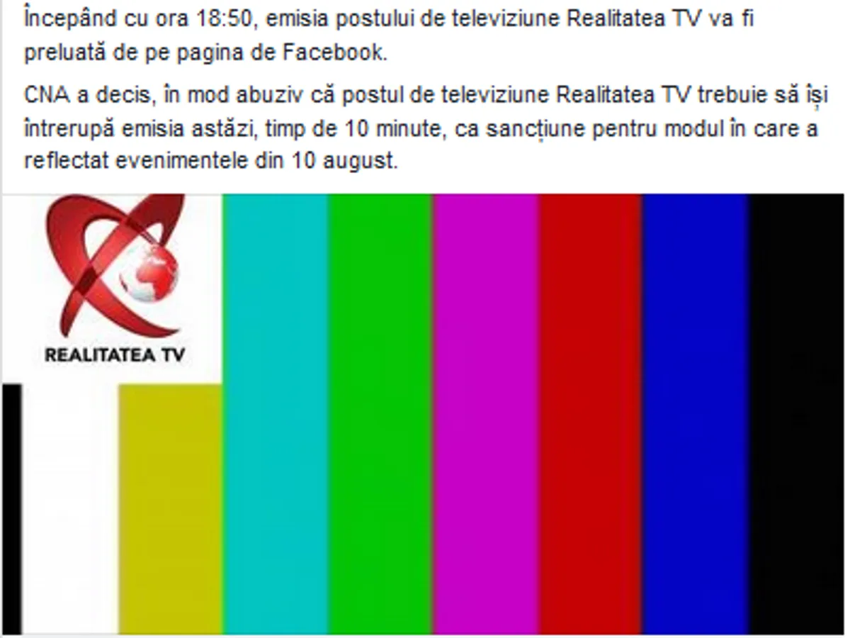 Postul Realitatea TV a găsit soluția pentru a sfida decizia CNA de a suspenda emisia timp de zece minute în această seară. Ca atare, postul va emite live, pe internet, potrivit unui anunț postat pe Facebook.