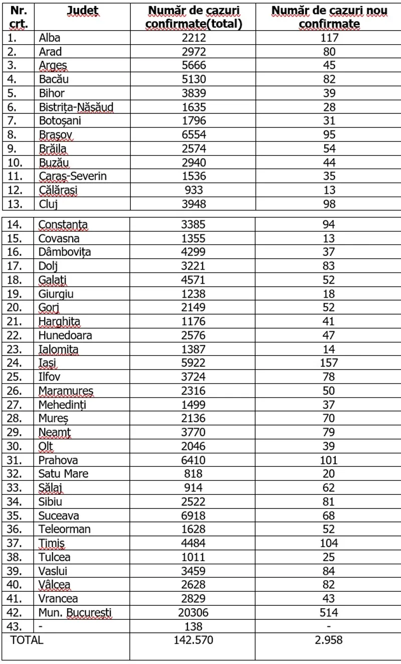 În total, în România au fost confirmate 142.570 de cazuri de infectare cu coronavirus, iar 5.203 oameni au murit.