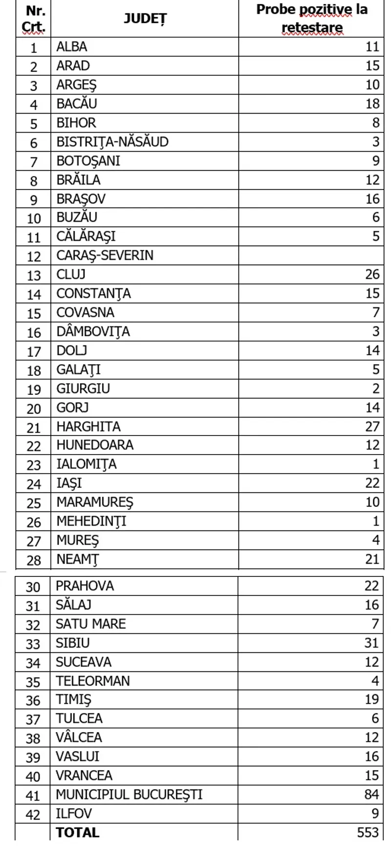 Distinct de cazurile nou confirmate, în urma retestării pacienților care erau deja pozitivi, 553 de persoane au fost reconfirmate pozitiv.