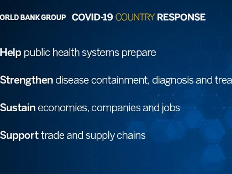 Grupul Băncii Mondiale pune la dispoziţie un pachet de finanţare cu aprobare rapidă în valoare de 14 miliarde dolari pentru a consolida răspunsul la efectele pandemiei de COVID-19 în ţările aflate în curs de dezvoltare şi pentru a reduce perioada de recuperare a acestora. Reacţia rapidă include finanţare, consiliere în materie de politici publice şi asistenţă tehnică pentru a ajuta ţările să facă faţă impactului generat de această pandemie în domeniul medical şi economic. IFC oferă o finanţare de 8 miliarde de dolari pentru a ajuta societăţile private afectate de pandemie şi pentru a contribui la păstrarea locurilor de muncă. IBRD şi IDA pun la dispoziţie o primă tranşă de 6 miliarde de dolari pentru a susţine intervenţia în domeniul asistenţei medicale.