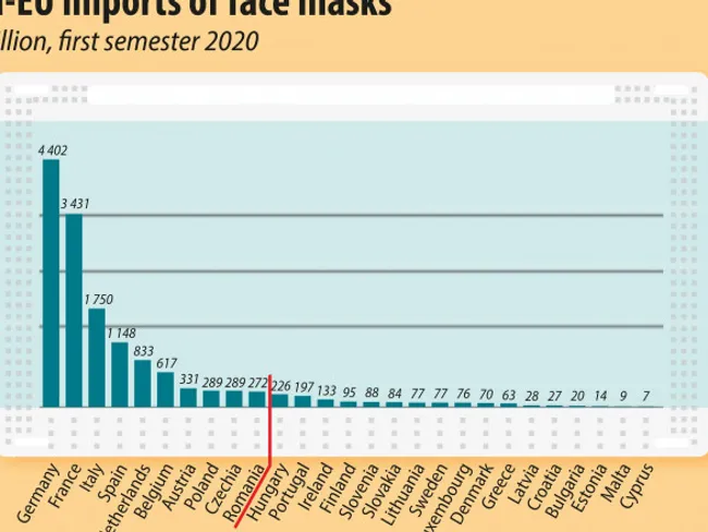 În schimb, importurile au fost mai mici de 10 euro pe cap de locuitor în Cipru, Polonia, Suedia, Croaţia, Grecia şi Bulgaria. După acest indicator, România se situează în a doua jumătate a clasamentului, cu importuri per capita de măşti facile în valoare de 14 euro, devansând Danemarca cu 12 euro pe cap de locuitor.
