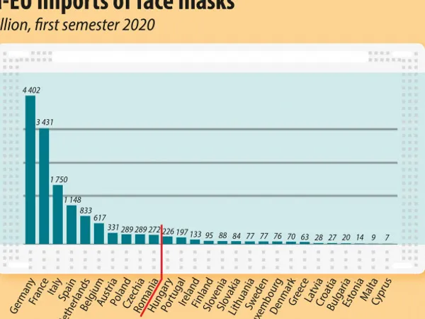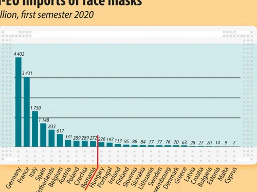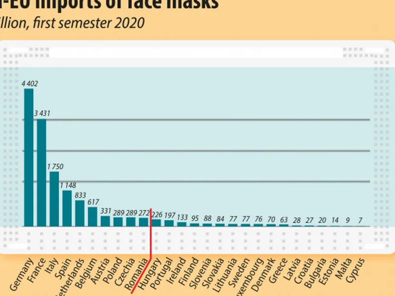 România a importat măşti faciale în valoare de 272 milioane de euro în primul semestru al acestui an, situându-se pe locul 10 în UE, arată datele publicate marţi de Eurostat.