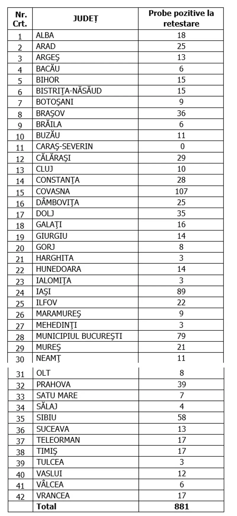 Distinct de cazurile nou confirmate, în urma retestării pacienților care erau deja pozitivi, 881 de persoane au fost reconfirmate pozitiv.