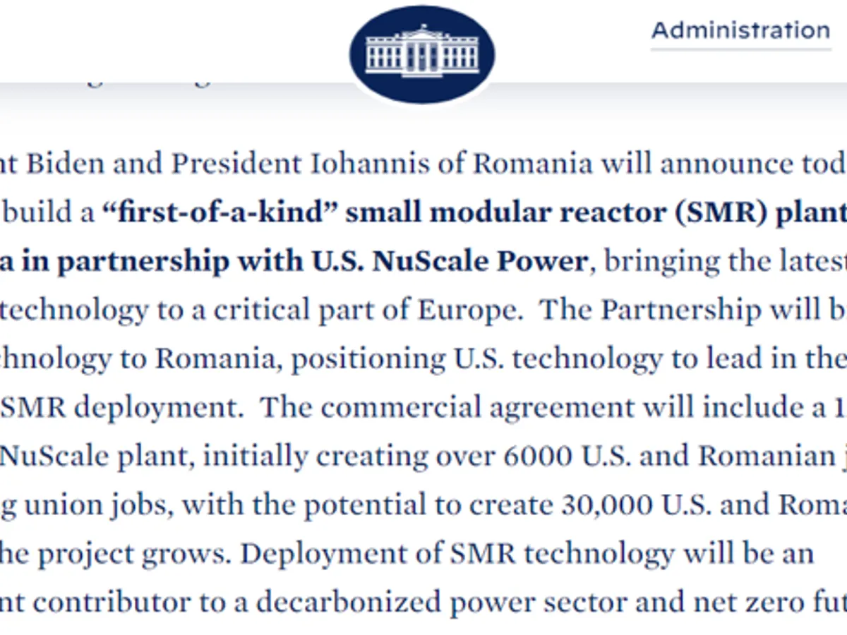 În comunicat se arată că președinții Iohannis și Biden vor anunța planurile de a construi o centrală mică de reactoare modulare (SMR) „prima de acest fel” în România, în parteneriat cu US NuScale Power, „aducând cea mai recentă tehnologie nucleară civilă într-o parte critică a Europei”.