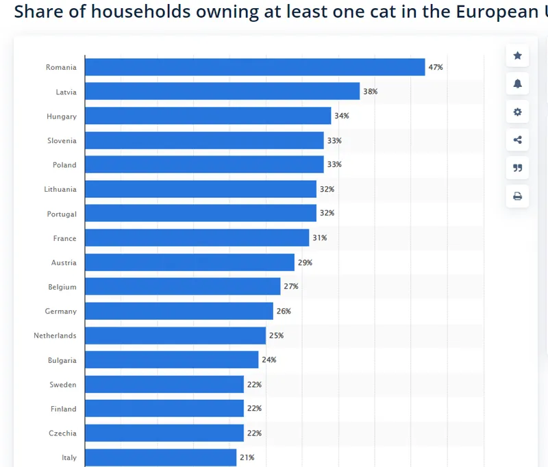 Situația e similară și la pisici. România s-a clasat pe primul loc din UE, anul trecut, cu 47% dintre gospodăriile deținând pisici în 2020, urmată de Letonia cu 38%.
