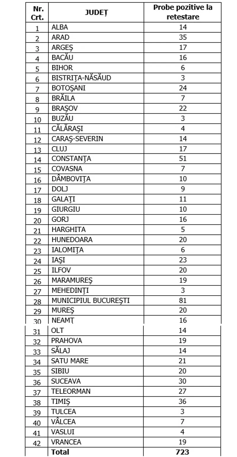 Distinct de cazurile nou confirmate, în urma retestării pacienților care erau deja pozitivi, 723 de persoane au fost reconfirmate pozitiv.