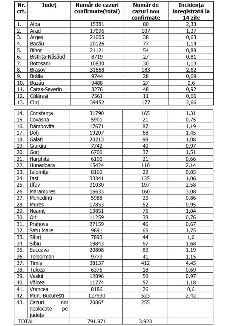 În total, în România au fost confirmate, până în prezent, 791.971 de cazuri de infectare cu coronavirus, iar 20.167 de persoane infectate au murit.