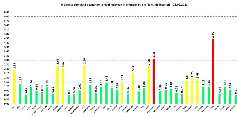 Județul Maramureș intră din nou în scenariul roșu, cu o rată de infectare de 3,08 la mia de locuitori, iar județul Timiș raportează joi o rată de infectare cumulată de 4,45 la mia de locuitori.